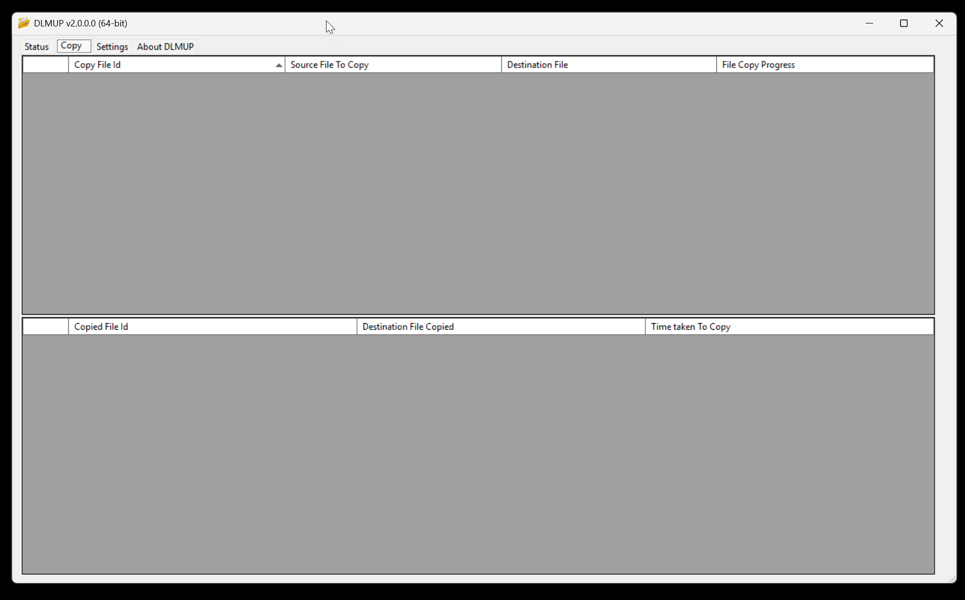 Added in DLMUP version 2.0.0.0, the Copy tab shows all files in the copy queue that are yet to be copied or are being copied, and their copy progress status. Below that is another grid that shows all files that have completed their copying from the copy queue.